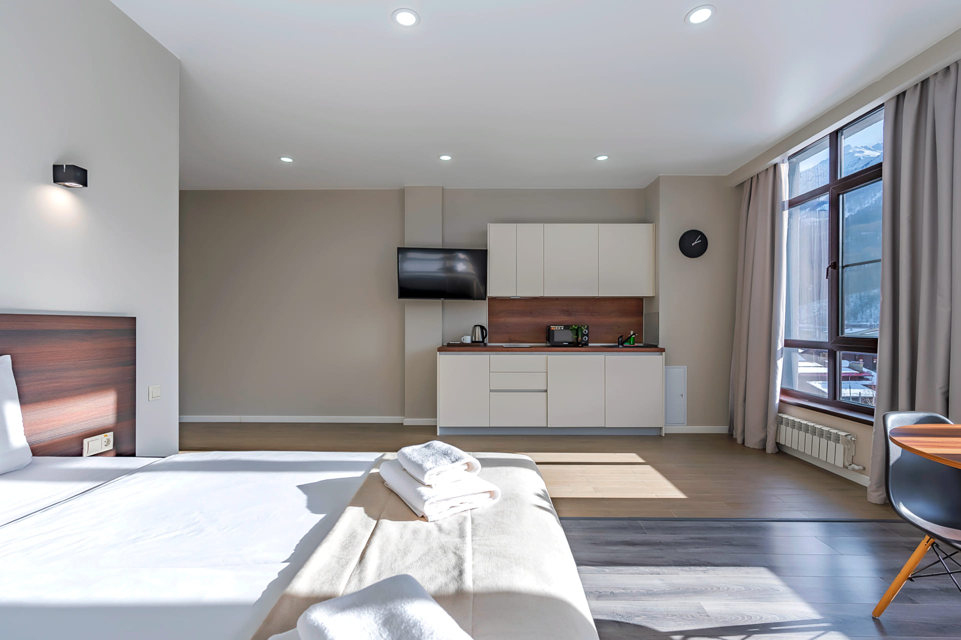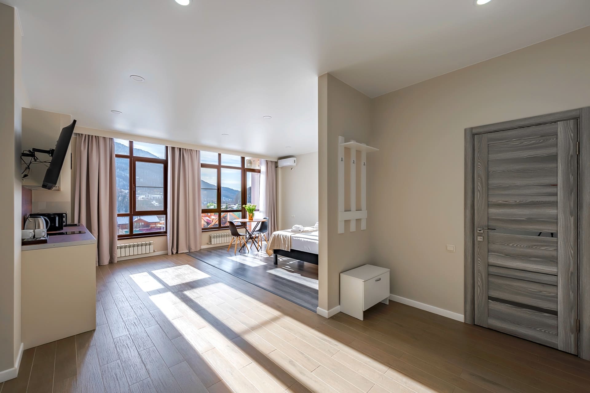 Для наслаждения отдыхом для вас в нашем отеле: просторные номера с кухнями и потрясающими видами, чудесная СПА-зона с тёплым бассейном, красивая зона лобби-бара, уютное кафе, удобный конференц-зал, лыжная комната, подземная парковка, свой трансфер, чистейший воздух и отличный сервис.
