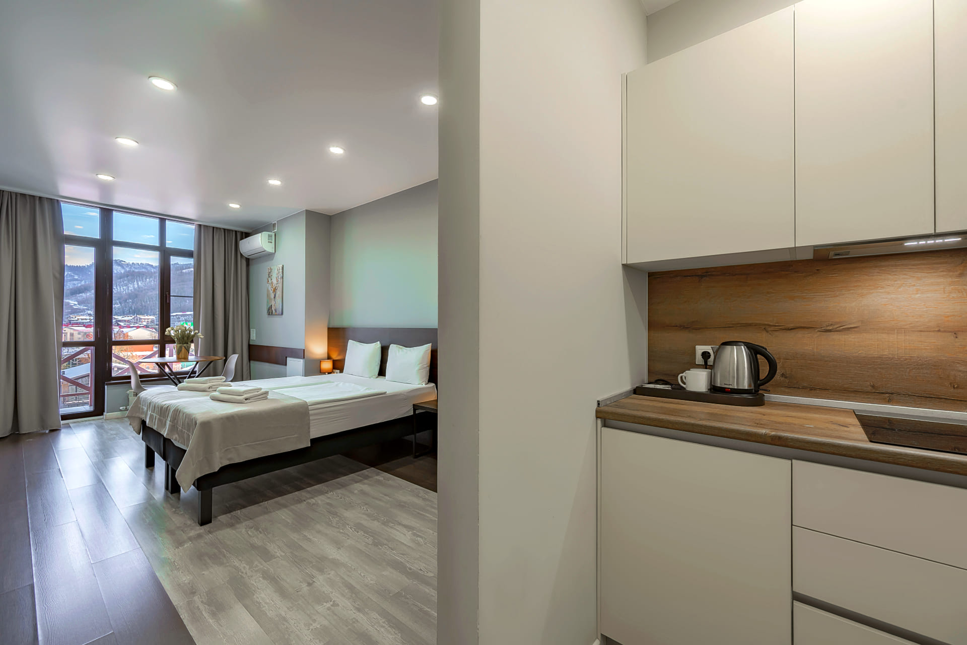 Для наслаждения отдыхом для вас в нашем отеле: просторные номера с кухнями и потрясающими видами, чудесная СПА-зона с тёплым бассейном, красивая зона лобби-бара, уютное кафе, удобный конференц-зал, лыжная комната, подземная парковка, свой трансфер, чистейший воздух и отличный сервис.